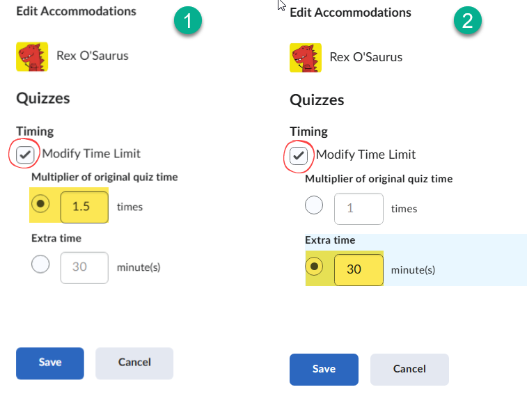 IMPORTANT: Quiz-specific special access can overwrite an accommodation for any user on a quiz-by-quiz basis.
