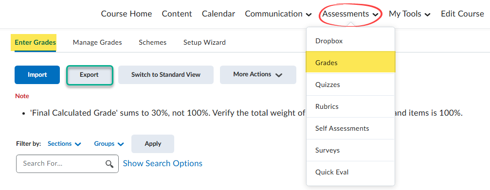 Using the Export function in the Grades tool