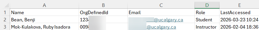 The exported file includes user details such as Name, OrgDefinedId (UCID number), Email address, Course Role, and Last (Course) Access Date.
