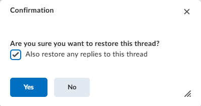 If the message thread you are restoring contains reply messages and you would like to restore them, place a checkmark in the “Also restore any replies to this thread” box. Click Yes to complete the process.