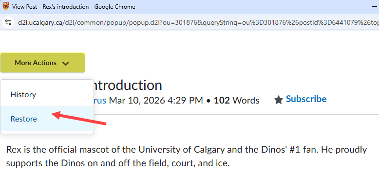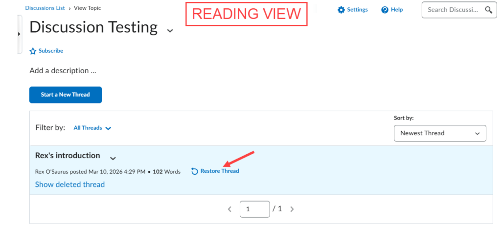 In the event that you accidentally delete discussion posts, those posts can be restored using the following procedure. NOTE: Only users with appropriate roles in the course (for example, Instructor or TA – Full Access) have permission to delete or restore Discussion posts.